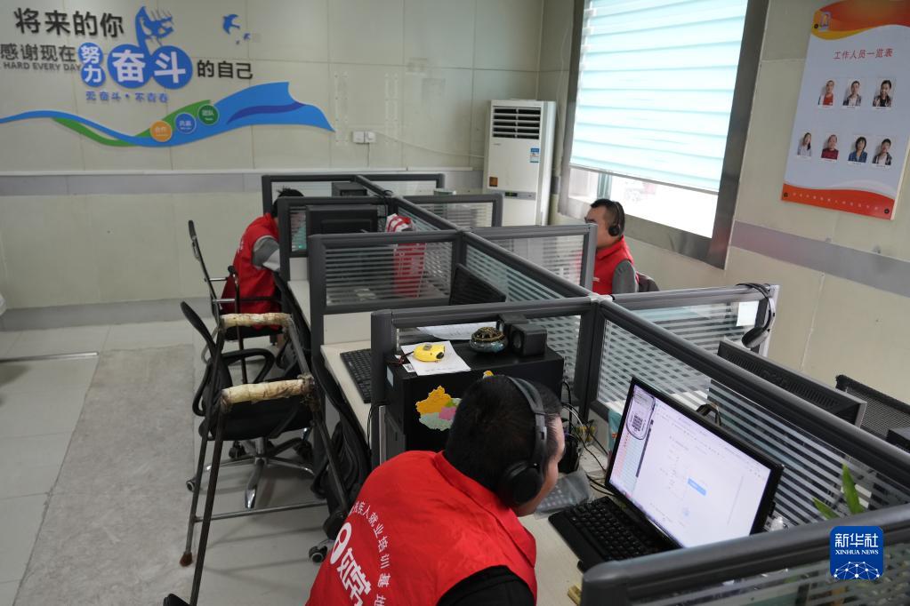 2月12日,在山东邹城市中心店镇如康家园内,残疾人在进行电话客服工作。