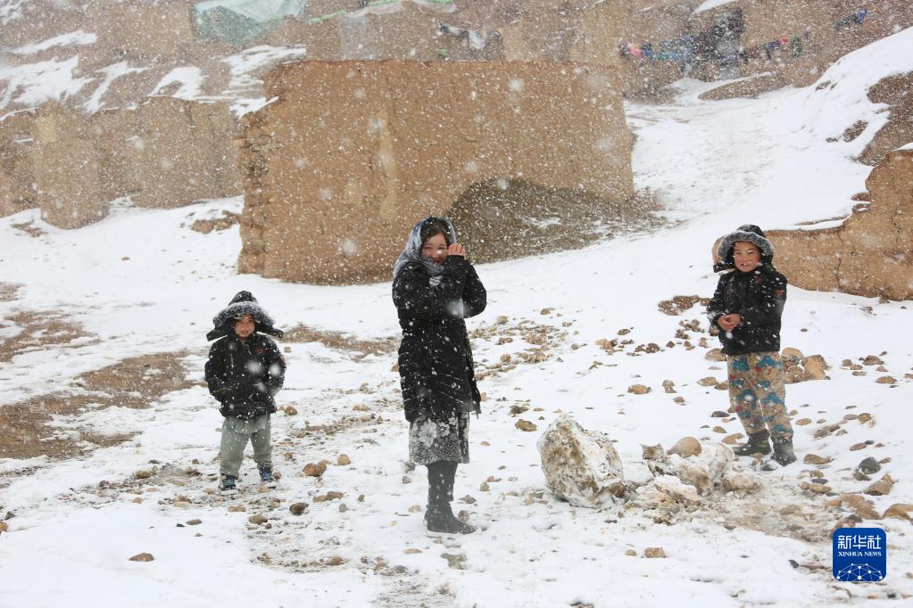 2月9日,孩子们在阿富汗巴米扬省的雪地上玩耍。