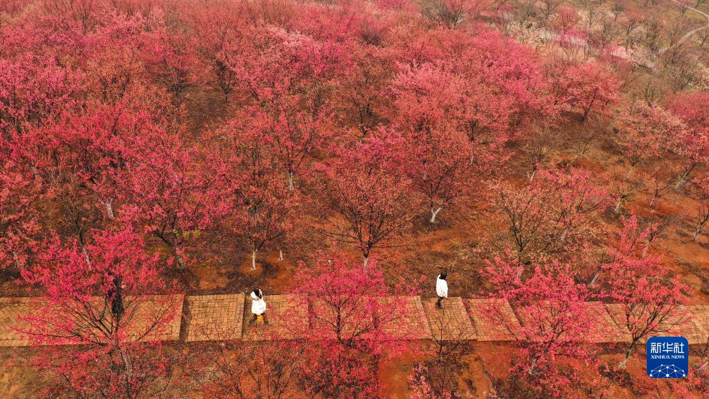 2月12日,游客在湖南省常宁市罗桥镇庙山村樱花园赏樱游玩(无人机照片)。