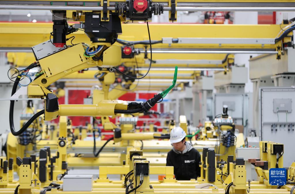 2月12日,德清县雷甸镇一家高空作业机械生产企业“未来工厂”车间,工人在调试智能化生产线。