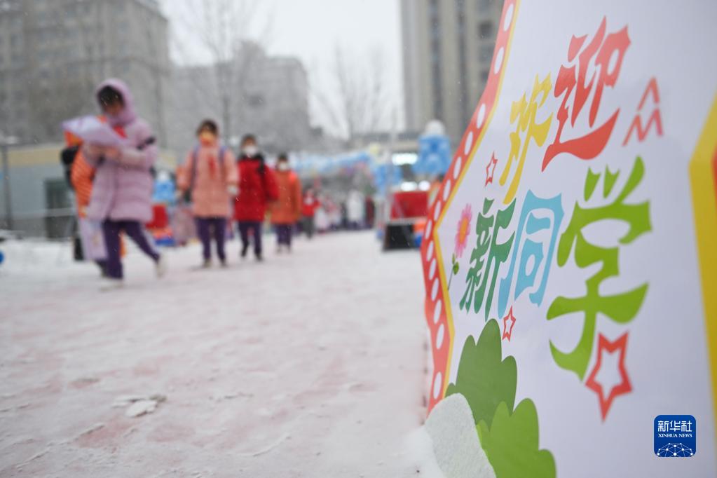 当日,青海省西宁市的小学生迎来开学首日,孩子们在降雪中开启新学期。