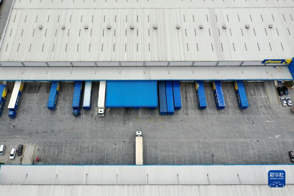 2月13日,快递运送货车停靠在贵州快递物流园内(无人机照片)。