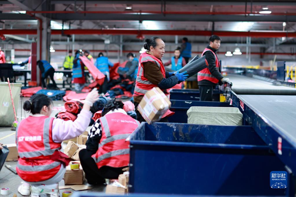 2月13日,工作人员正在贵州快递物流园内分拣快递。