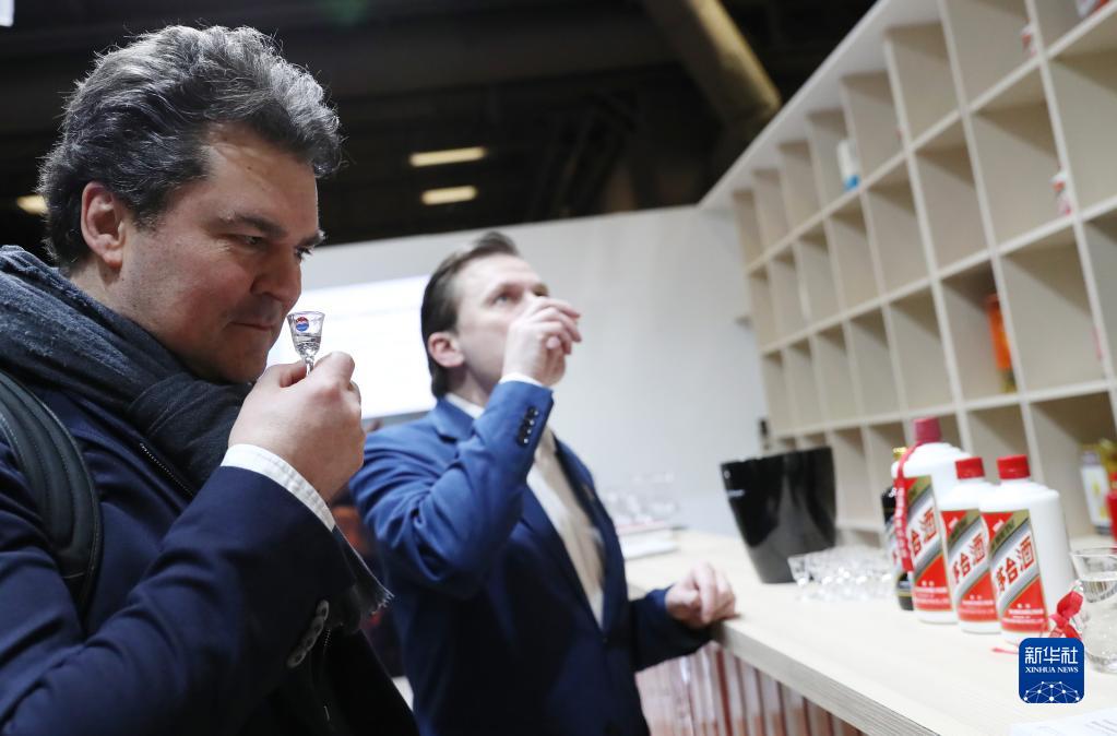 2月13日,嘉宾在法国巴黎国际葡萄酒及烈酒博览会上品尝贵州茅台酒。