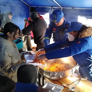 2月13日,中国蓝天救援队在土耳其马拉蒂亚向当地受灾民众分发食物。