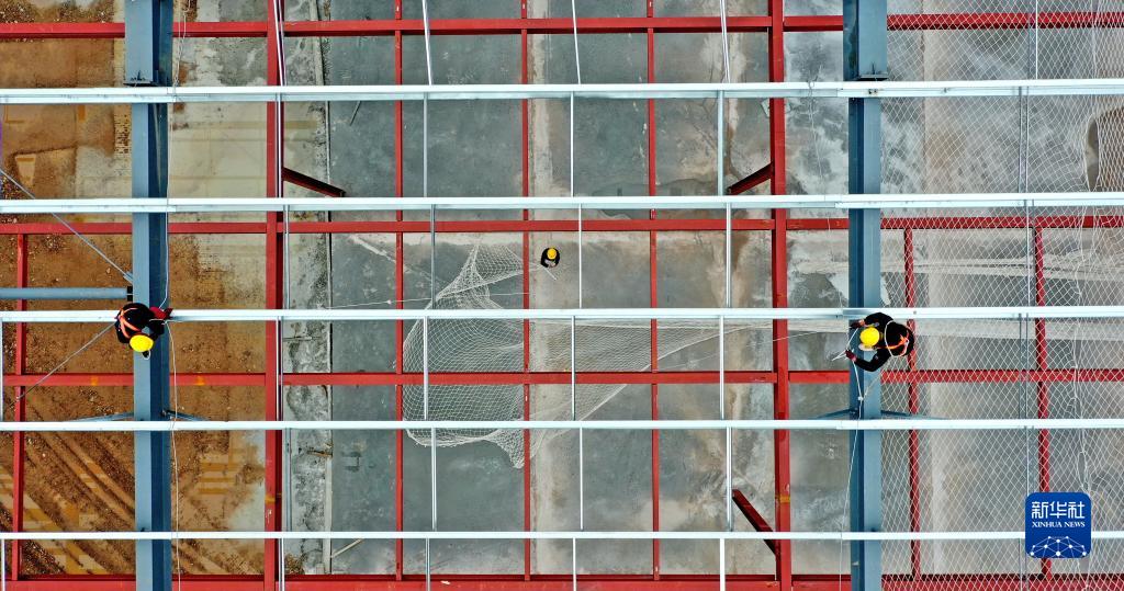 2月14日,在浙江省台州市仙居县下各镇的比亚迪新能源刀片电池项目建设现场,施工人员加紧标准化厂房和配套设施建设(无人机照片)。