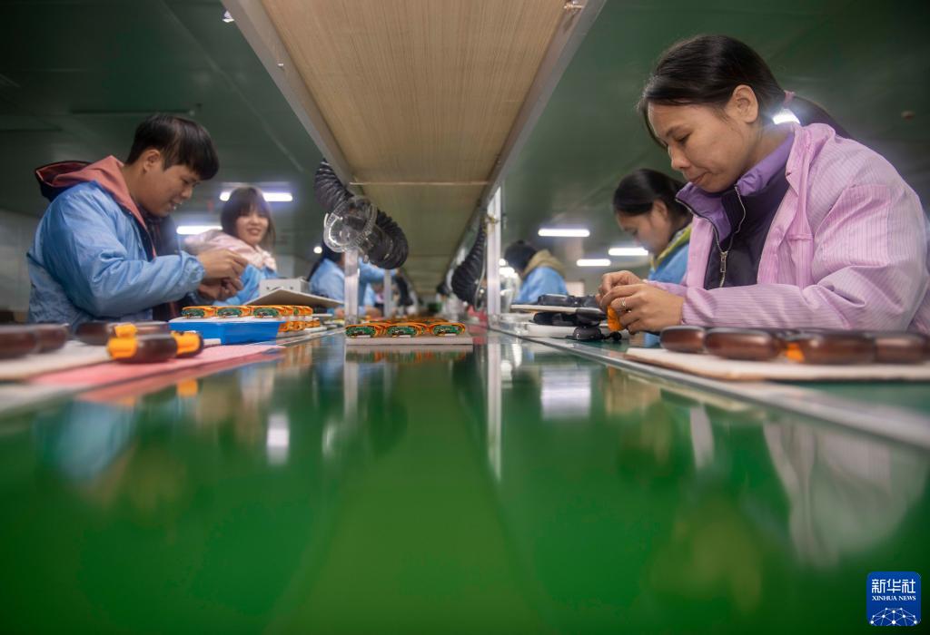 2月13日,在湖南省永州市道县高新技术产业开发区一电子公司,工人在流水线上忙碌。