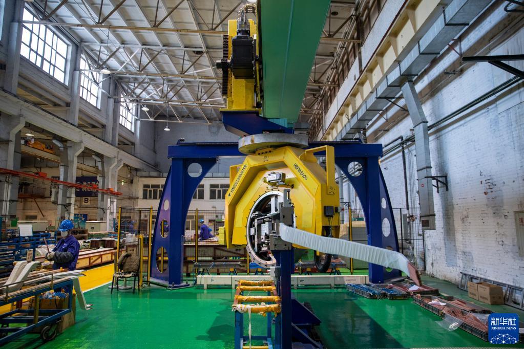 这是2月13日在哈电集团哈尔滨电机厂有限责任公司生产车间内拍摄的正在运行的定子线棒自动成型机。