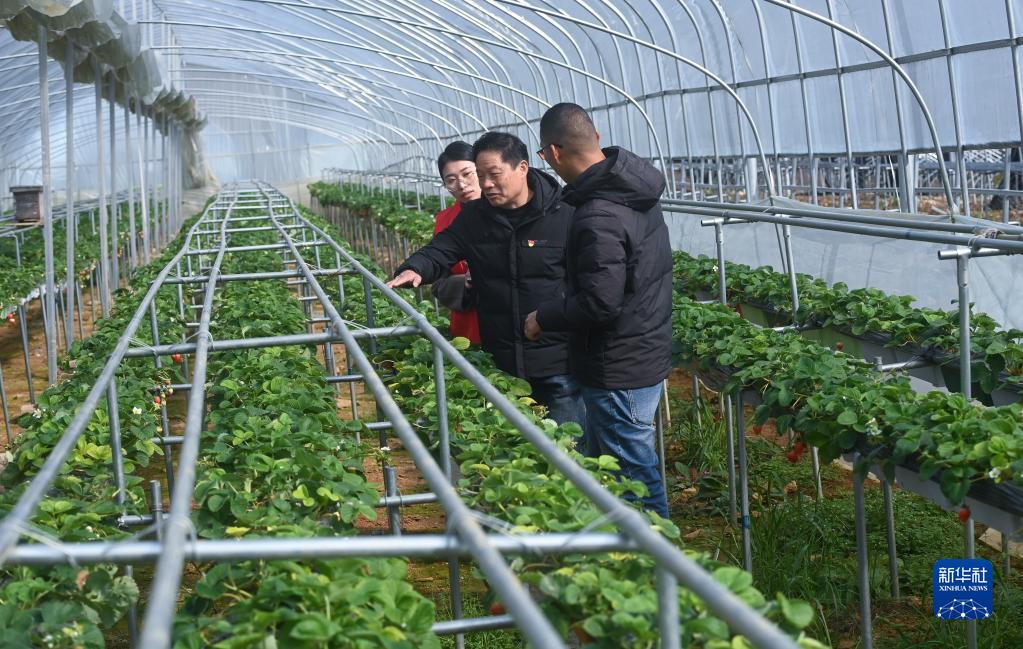 2月14日,在杭州市临安区板桥镇草莓种植基地内,“田间课堂”小分队的农技专家马绍钢(中)在了解立体栽培的有机草莓的生长及销售情况,并对种植户提出的问题进行解答。