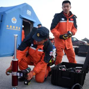 2月11日,在位于土耳其哈塔伊省哈塔伊体育馆外的中国救援队营地,救援队队员检查设备。