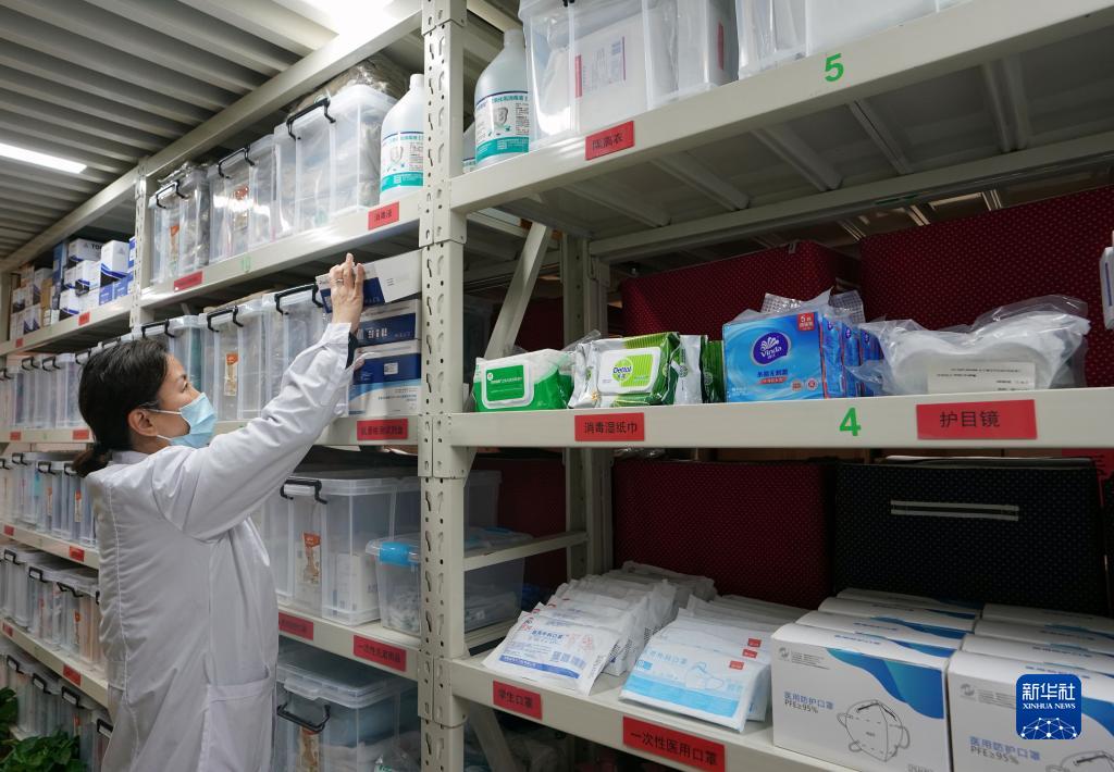 2月13日,上海市长宁区天山第一小学的卫生老师在仓库内整理防疫用品。