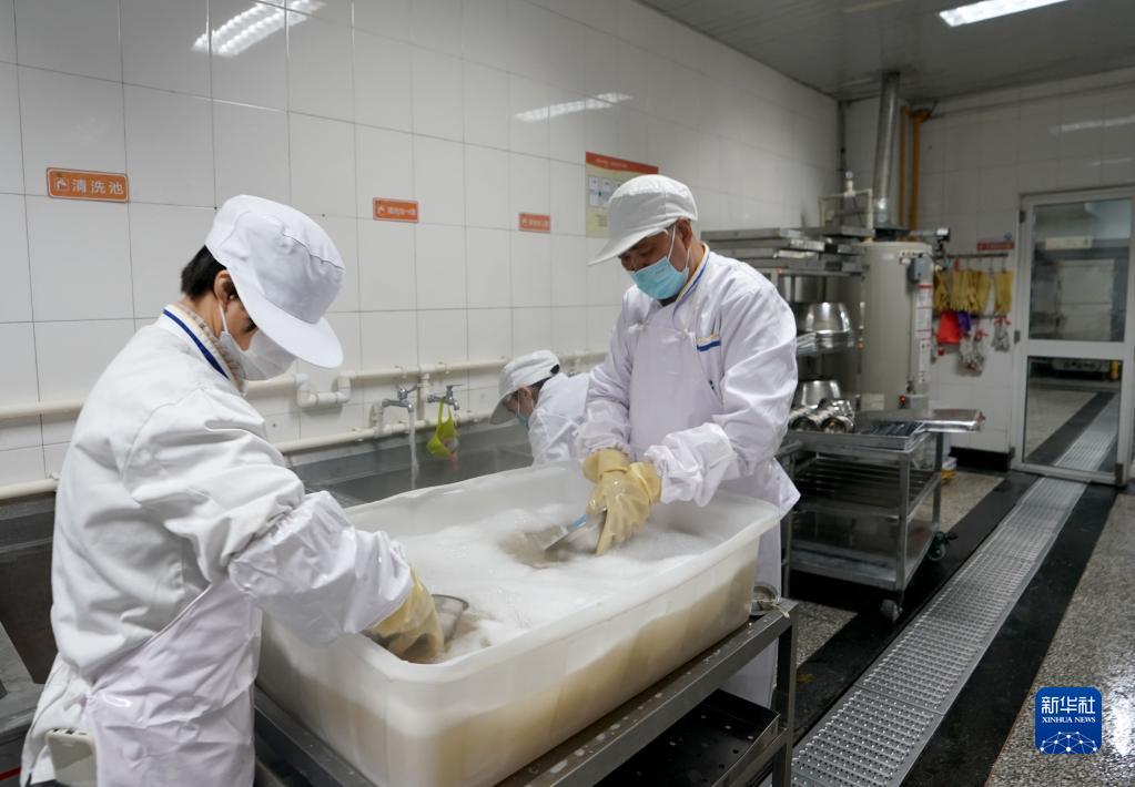 2月13日,上海市长宁区天山第一小学的食堂员工在整理后厨。