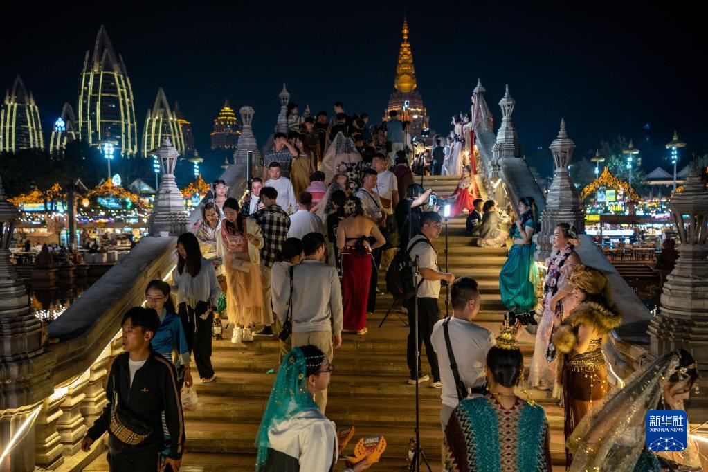 2月13日,游客在西双版纳州景洪市告庄西双景星光夜市游览、拍照。