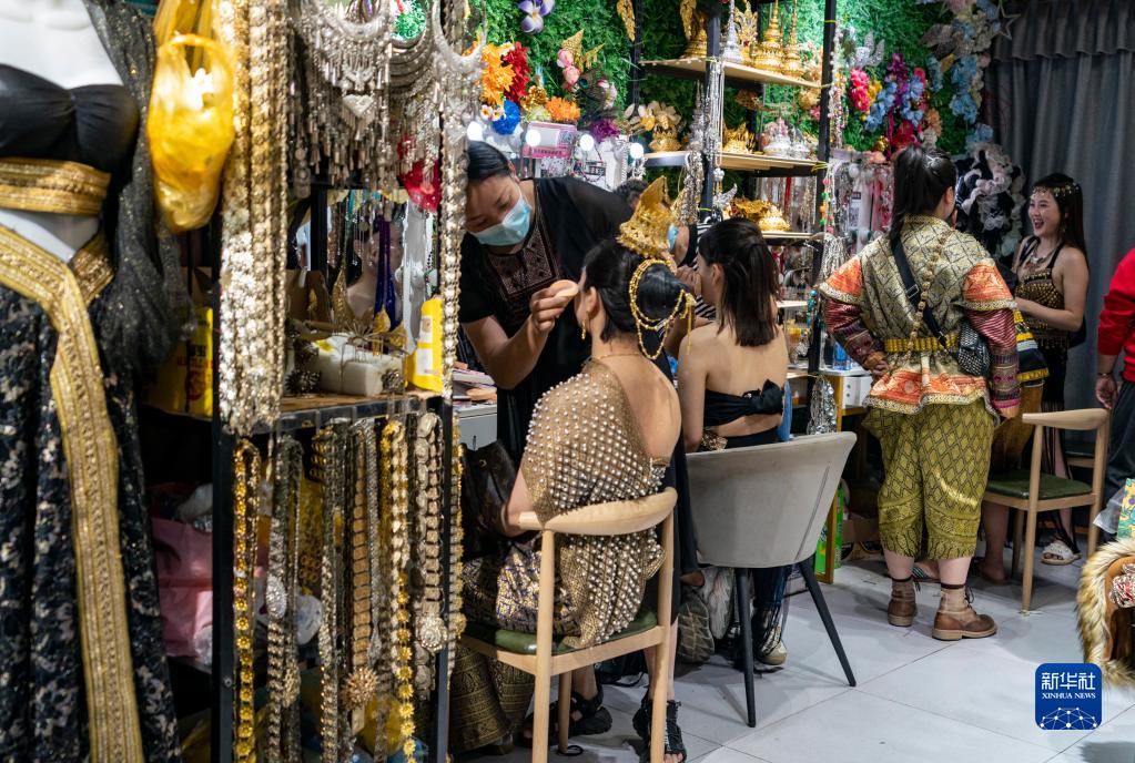 2月12日,一名化妆师在西双版纳州景洪市告庄西双景星光夜市为准备旅拍的游客化妆。