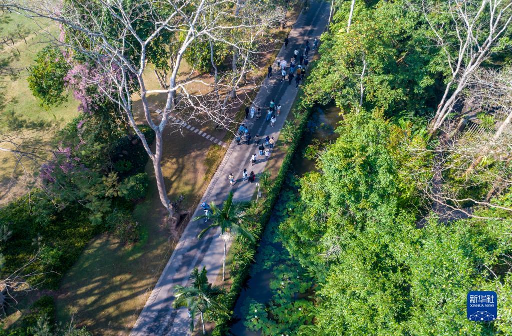 2月12日,游客在位于西双版纳州勐腊县勐仑镇的中国科学院西双版纳热带植物园内游览(无人机照片)。