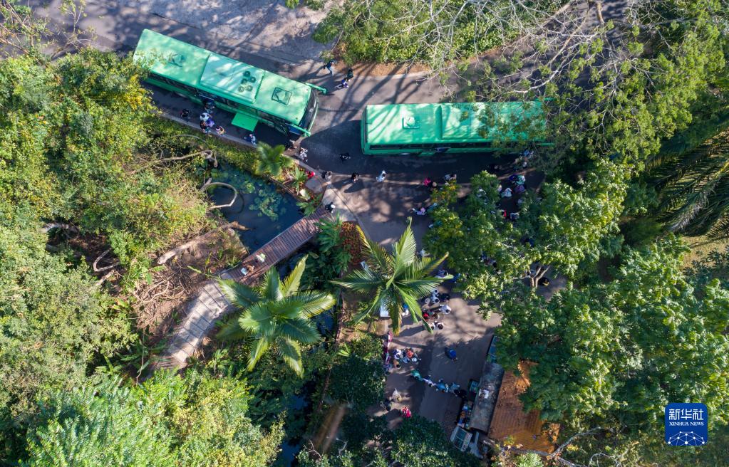 2月12日,游客乘坐旅游大巴抵达位于西双版纳州勐腊县勐仑镇的中国科学院西双版纳热带植物园(无人机照片)。