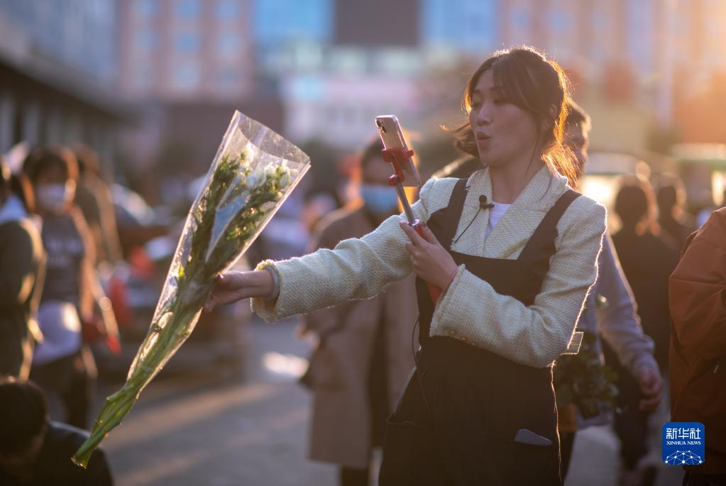 主播毕茜茜在斗南花卉交易市场为顾客介绍鲜切花(2月13日摄)。