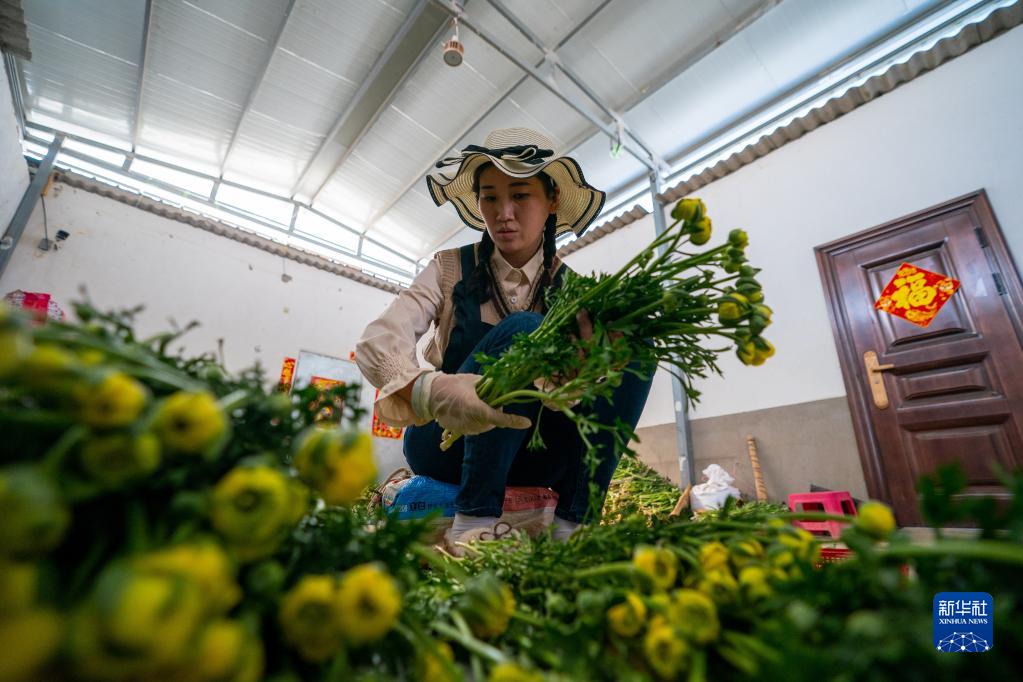 主播毕茜茜在分拣刚采摘的鲜花(2月12日摄)。