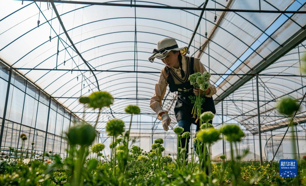 主播毕茜茜在采摘鲜花(2月12日摄)。