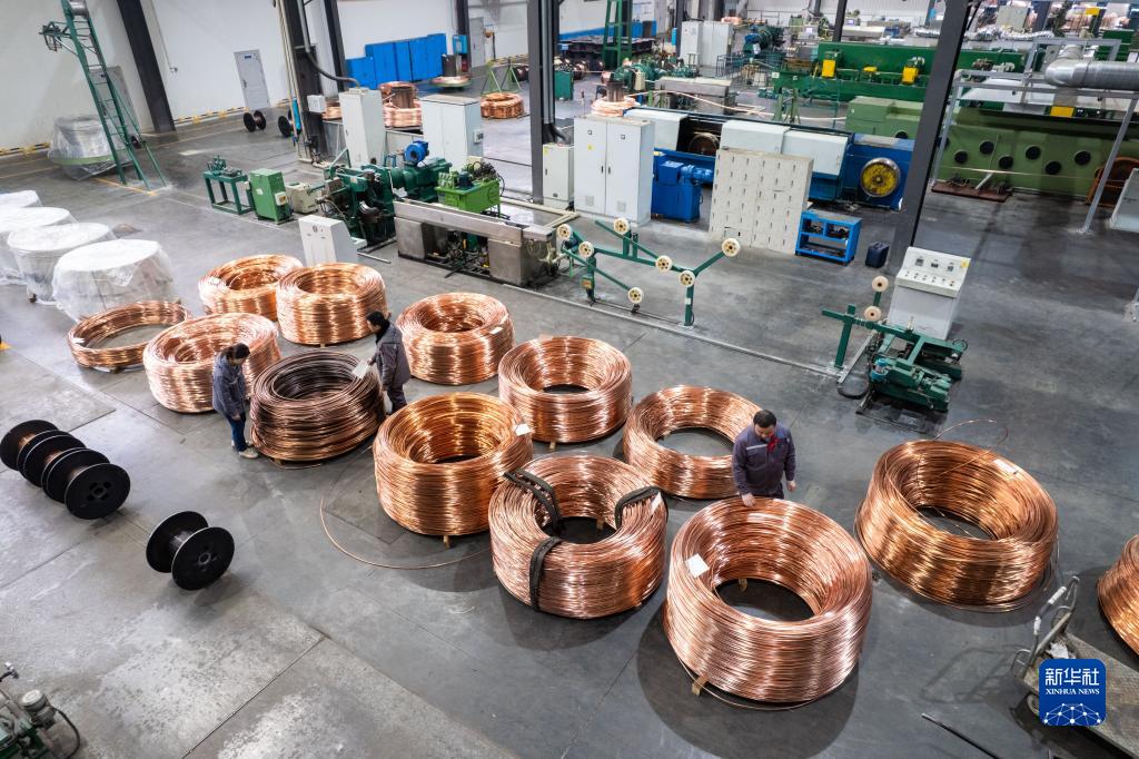 2月14日,在位于株洲市渌口经开区南洲工业园的株洲兆源机电科技有限公司,工作人员在检查生产电磁线的原材料质量(无人机照片)。