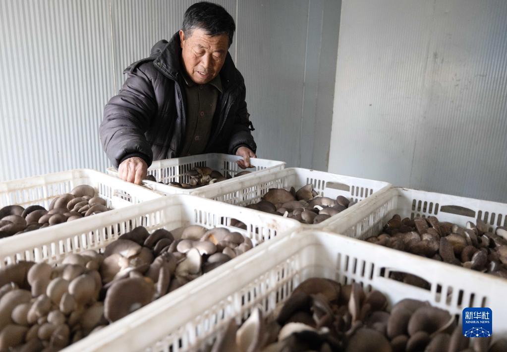 2月15日,河北省唐山市丰南区东田庄乡大吴庄村的农民在库房码放刚采摘的平菇。