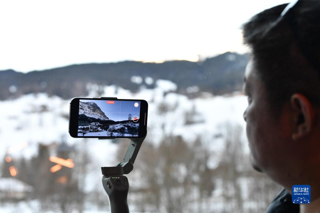 2月14日,一名中国游客在瑞士少女峰拍摄雪山景色。