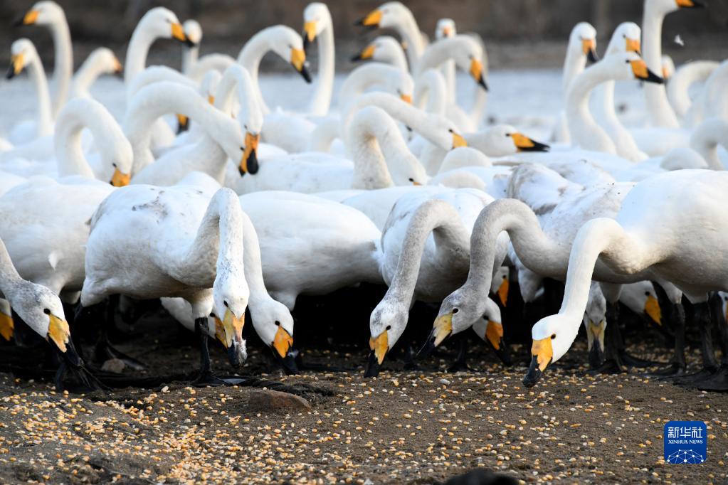 大天鹅在荣成市大天鹅国家级自然保护区一处食物投放点进食(2月14日摄)。