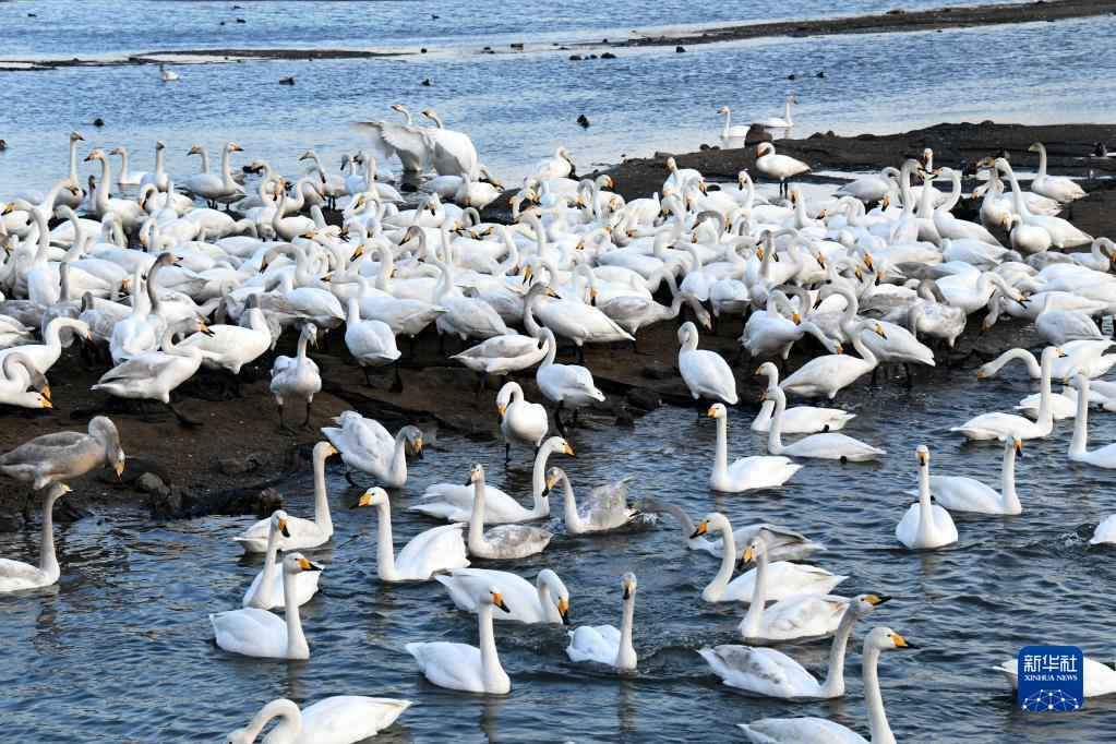 大天鹅在荣成市大天鹅国家级自然保护区一处食物投放点等候进食(2月14日摄)。