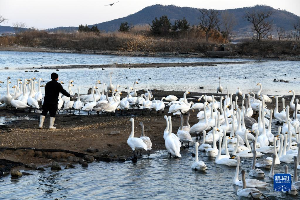 荣成市大天鹅国家级自然保护区工作人员给大天鹅投放食物(2月14日摄)。