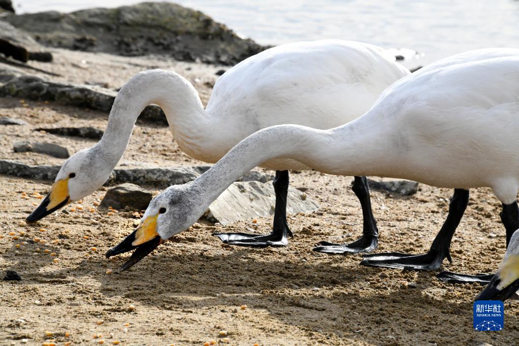 大天鹅在荣成市崖头街道樱花湖一食物投放点进食(2月15日摄)。