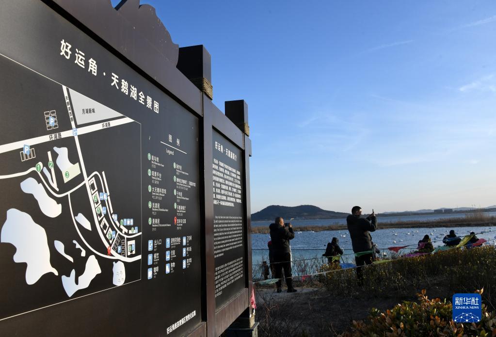 游客在荣成市大天鹅国家级自然保护区内的好运角·天鹅湖游玩、拍摄(2月14日摄)。