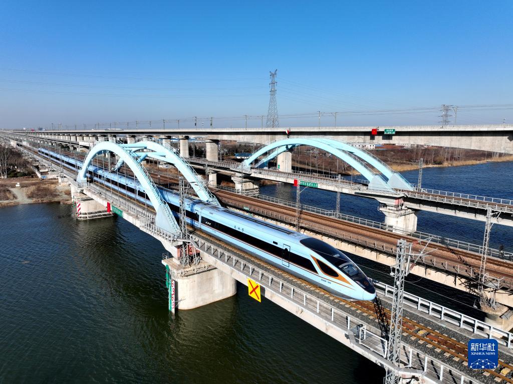 2月15日,列车驶过江苏省连云港市海州区境内的一座铁路桥(无人机照片)。