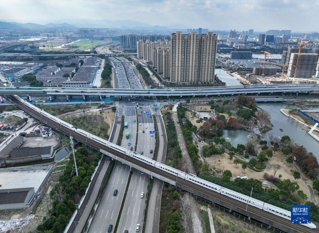 2月15日,列车行驶在浙江省宁波市鄞州区境内(无人机照片)。