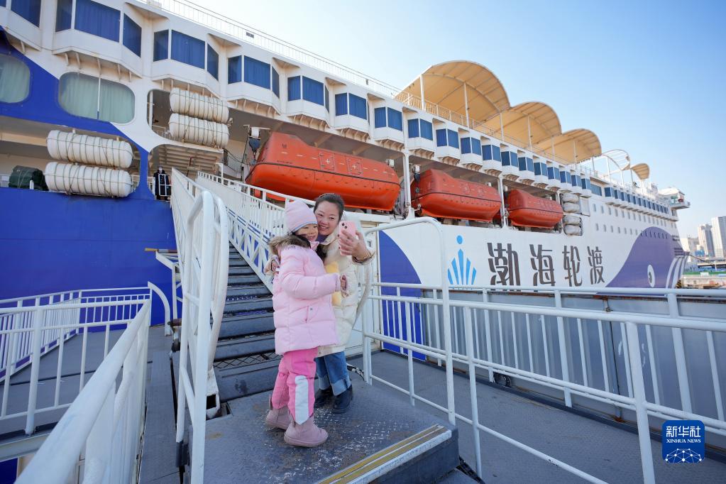 2月15日,在山东港口烟台港,一对母女在登船舷梯上合影。
