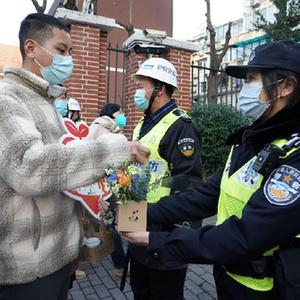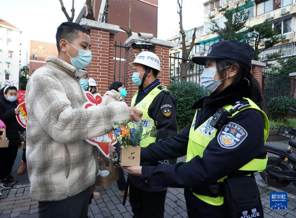 2月15日,黄浦区特殊教育职业学校的学生将咖啡与花赠送给护校警察。