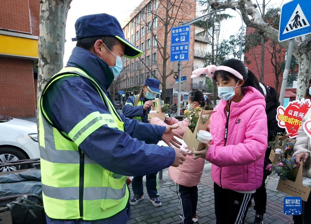 2月15日,黄浦区特殊教育职业学校的学生们将咖啡与花赠送给环卫工人。