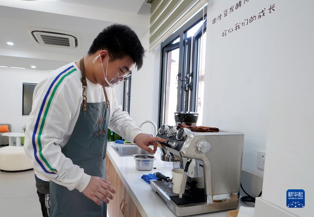 2月15日,黄浦区特殊教育职业学校的学生在制作咖啡。