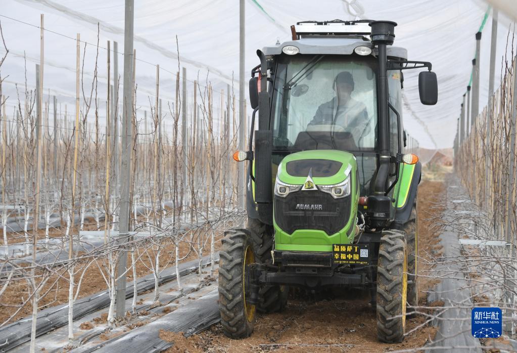 2月15日,工作人员在北京市峪口镇西樊各庄村京瓦果业科技示范园驾驶农机设备耕地。