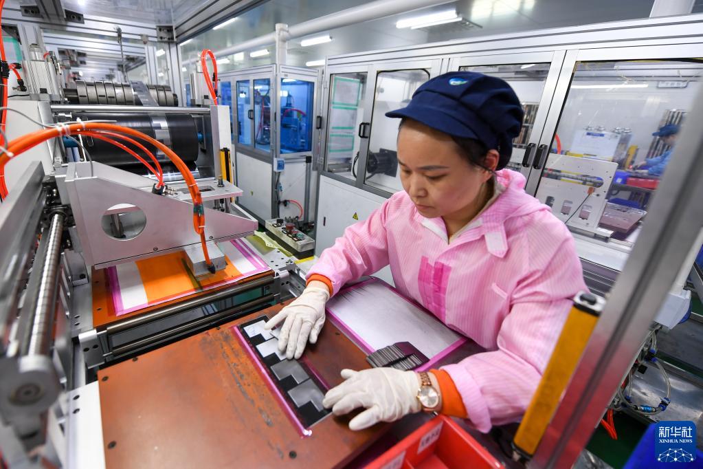 在常州富烯科技股份有限公司生产车间,工人在生产线上生产加工石墨烯导热膜(2月14日摄)。