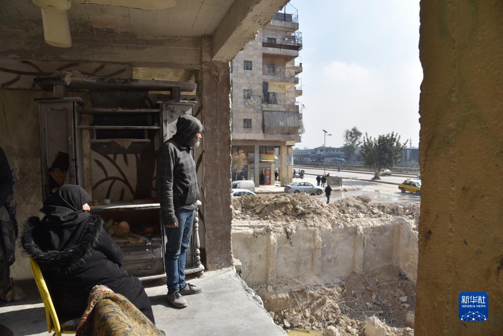 2月13日,在叙利亚地震灾区阿勒颇,一名男子站在受损的建筑中向外张望。