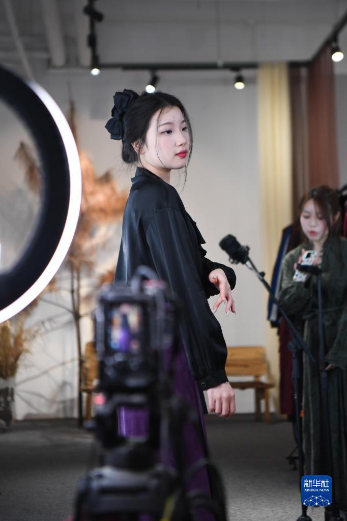 2月14日,主播在湖南省株洲市芦淞区的湖南素白服饰有限公司直播销售服装。