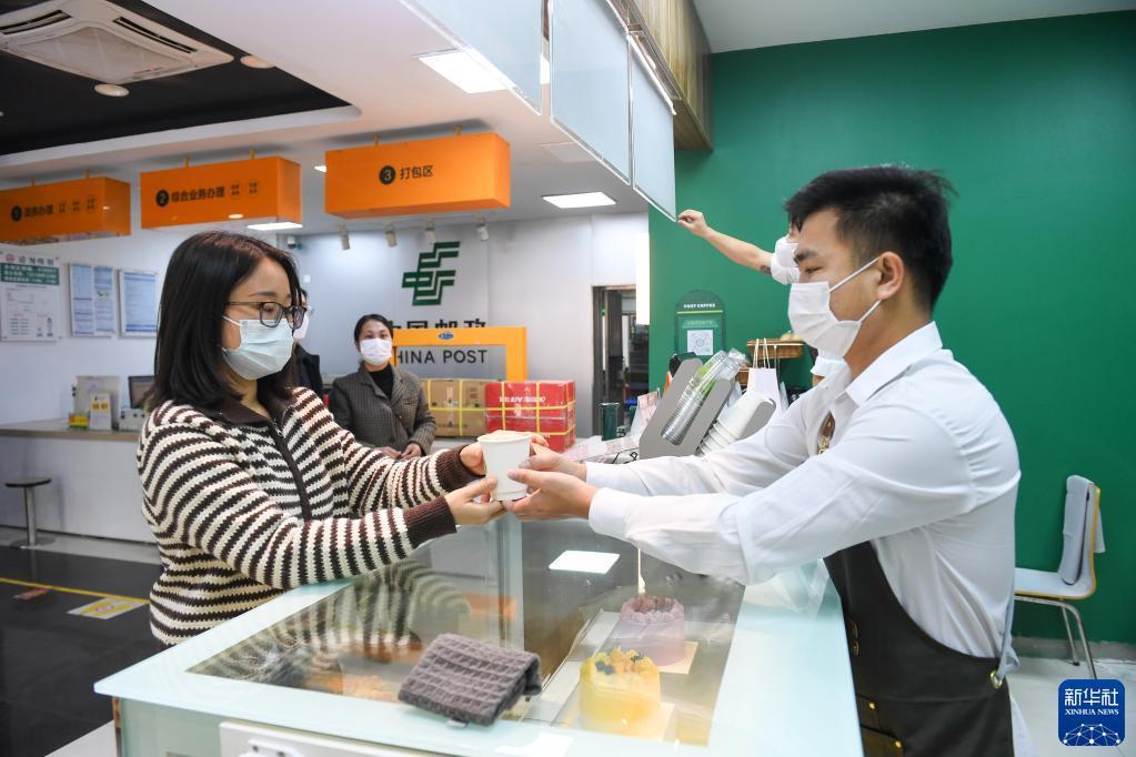 2月15日,顾客在深圳咖啡主题邮局取咖啡。