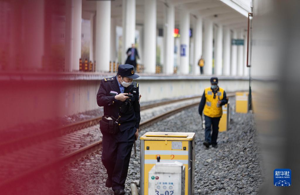 2月13日,车辆乘务员李金文(左)在成都西站轨道边巡检作业。