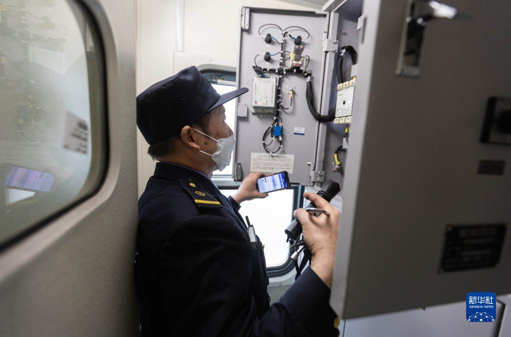 2月13日,车辆乘务员李金文在列车上检查车厢的配电箱。