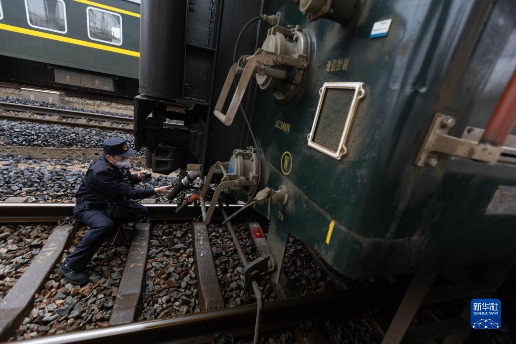 2月14日,列车在信阳站停靠期间,车辆乘务员李金文检查车厢与机车车头连接部位的装置。
