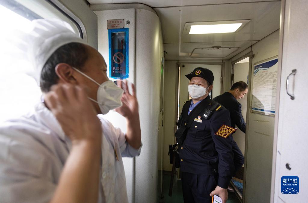 2月13日,车辆乘务员李金文与值乘的厨师同事打招呼。