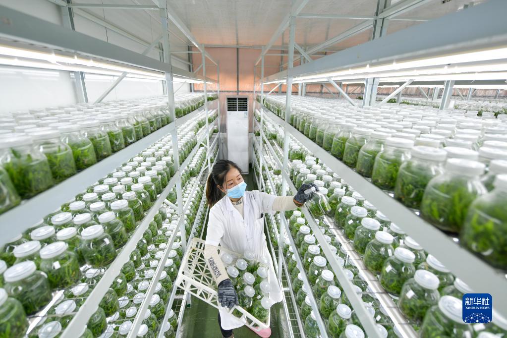 2月14日,工人在贵州省从江县贯洞镇铁皮石斛育苗基地的组培室里管护铁皮石斛苗。