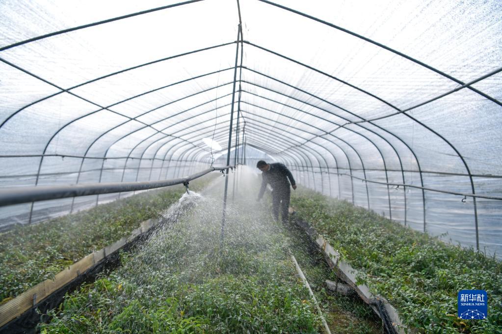 2月14日,在贵州省从江县贯洞镇铁皮石斛育苗基地,工人利用自动喷灌系统给铁皮石斛苗浇水。
