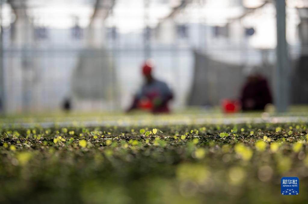 2月15日,工人在贵州省从江县贯洞镇淫羊藿育苗基地管护淫羊藿苗。