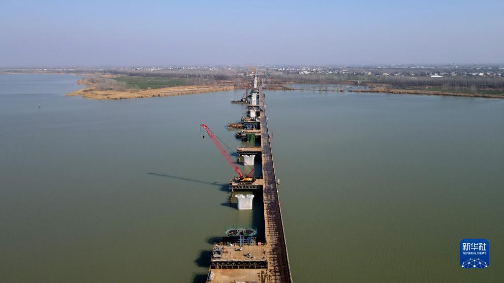 这是2月15日拍摄的合新铁路安徽段怀洪新河特大桥跨沱湖水中墩施工现场(无人机照片)。